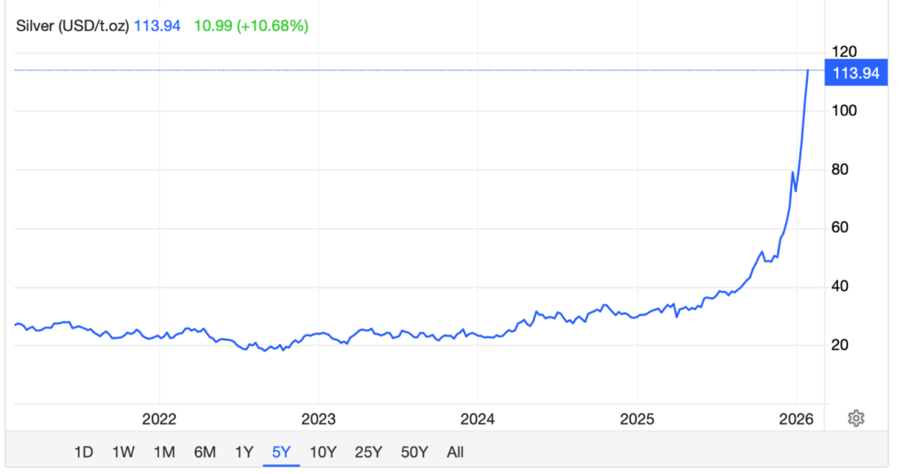 The silver–to–gold ratio (often expressed as gold–silver ratio) is the price of gold divided by the price of silver. Historically, this ratio has averaged around 60:1 and the ratio was over 90 in 2025, however, as of late January 2026, the gold-silver ratio is approximately 46:1 to 47:1. It has dropped due to silver’s parabolic rise. This means it takes roughly 46-47 ounces of silver to purchase one ounce of gold. This ratio represents a significant decrease (closer to silver being more expensive relative to gold) from recent highs, driven by a recent strong rally in silver prices.
