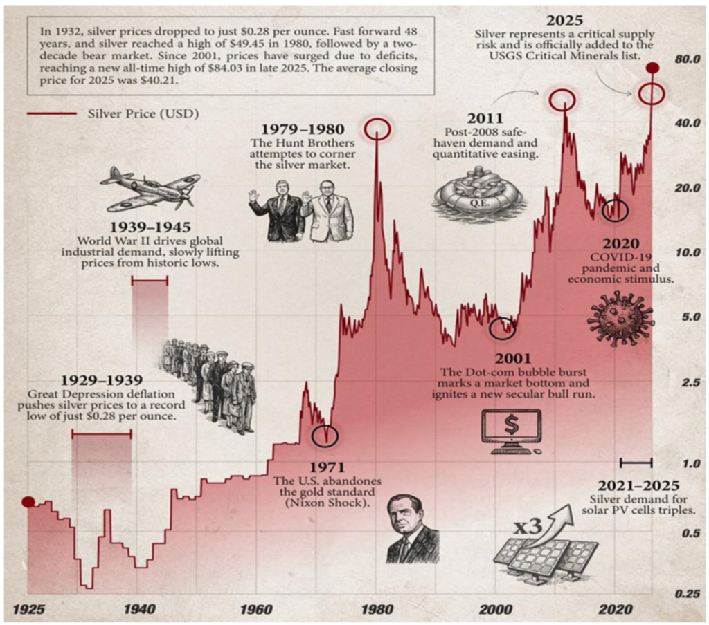 Because it is both an industrial input and a store of value, silver tends to be more cyclical and volatile than gold. The following graph explains 100 years history of silver driven by major events and policy shifts.