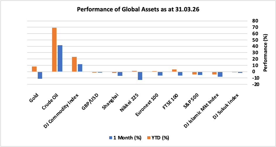 Looking at the performance, all major global financial assets, except crude oil, experienced drawdown and negative momentum amid geopolitical fears resulting from War in Middle East, despite resilient corporate earnings and positive developments in AI theme. Asian and European equity markets recorded significant losses as Japan’s Nikkei 225 led the fall-down with negative returns of over 13% followed by China’s Shanghai index that tumbled 6.5%. While in Europe, UK FTSE 100 and EU Euronext 100 plunged 6.20% and 6.10%, respectively, largely driven by higher energy prices and potential shocks. US S&P 500 declined by roughly 5% whereas DJ Islamic Markets Index booked negative 7.7% returns during the month. DJ Sukuk Index ended the month down 2.17% amid rising yields. In commodities, DJ Commodity index climbed nearly 12% driven by 41.5% surge in Crude oil prices, although gold plunged by 11% on US dollar strength, which appreciated 1.74% against UK pound.