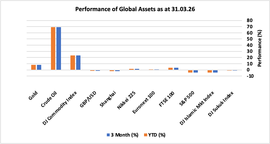 Looking at the performance, most of the major global financial assets experienced extreme volatility and negative momentum (except commodities) in Q1 amid geopolitical fears resulting from War in Middle East, despite resilient corporate earnings and positive developments in AI theme. US equity markets recorded significant losses as S&P 500 declined by 4.33% whereas DJ Islamic Markets Index booked negative 4.25% returns during the month. While in Europe, UK FTSE 100 and EU Euronext 100 delivered positive 3.42% and 0.77%, respectively, largely driven by higher energy sectors weight in the indices. In Asia, Japan’s Nikkei 225 rose by 1.44% while China’s Shanghai index tumbled 1.94%. DJ Sukuk Index ended the month down 1.14% amid rising yields whereas US dollar strengthened, which appreciated 1.71% against UK pound. In commodities, DJ Commodity index climbed by 23.5% driven by nearly 69% surge in Crude oil prices amid extreme geopolitical risks.