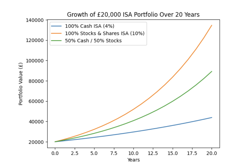 Let’s consider a hypothetical example. Assume 4% return on Cash ISA and 10% long-term average return on stocks (The MSCI World Islamic Index or DJ Dow Jones Islamic Market World Index). Below is a performance comparison table showing how a £20,000 ISA portfolio could grow over 5, 10, and 20 years under three scenarios, assuming annual compounding and no taxes (as per ISA rules).