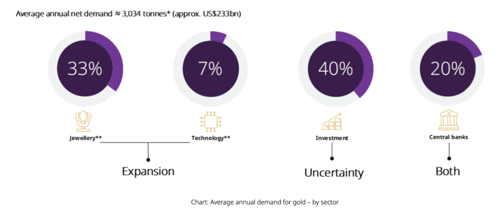 The demand for gold comes from four broad sectors: jewellery, investment, central banks and technology. Historically jewellery has represented the largest share; it still accounts for around half of annual demand over long periods, though its share has declined as investment and central‑bank demand have risen.