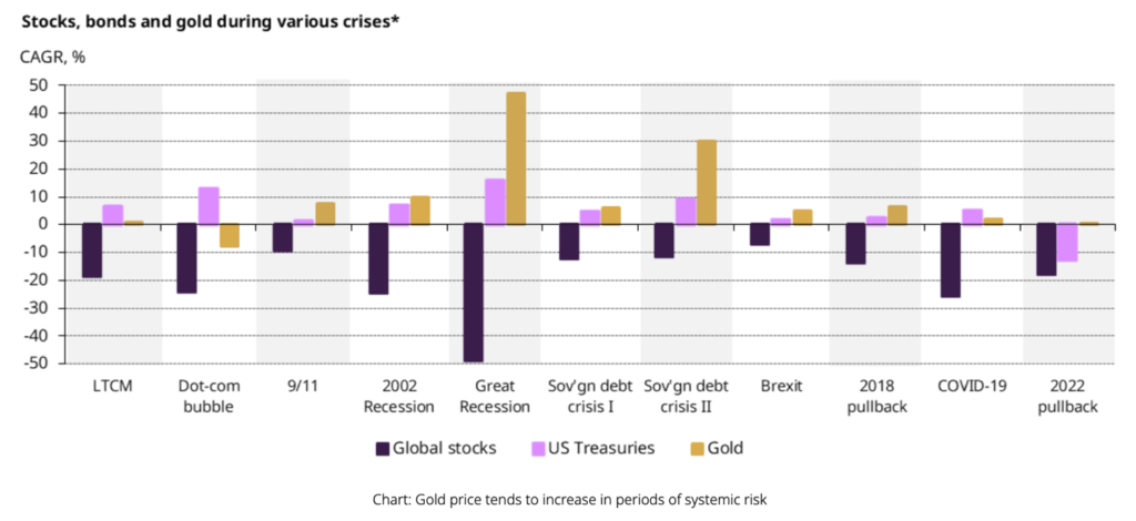 The following graph explains how gold has performed during periods of heightened uncertainty and financial markets stress.